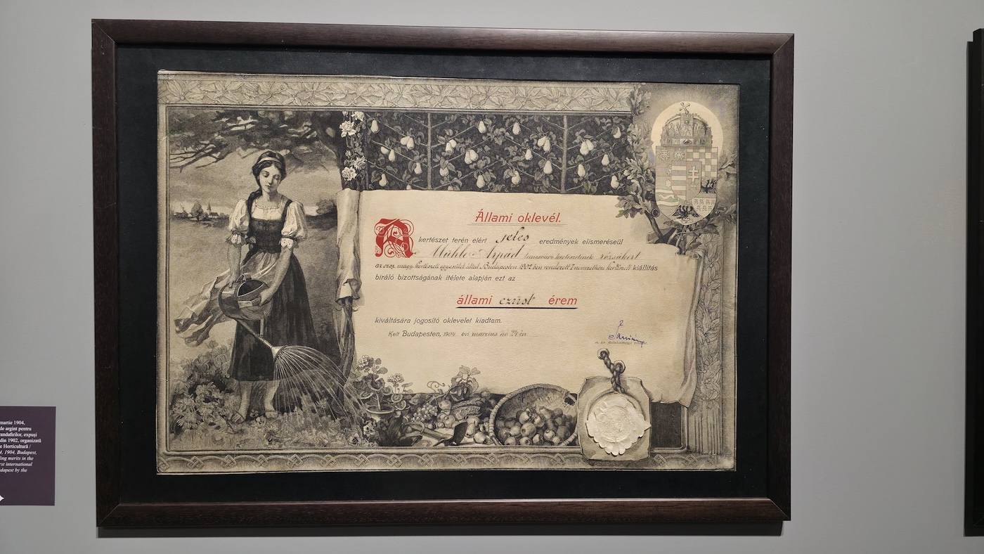 Un alt exponat care mi-a atras atenția este diploma de stat a lui Árpád Mühle, în 1904, la Budapesta, prin care acestuia i s-a acordat medalia de stat de argint pentru merite deosebite în domeniul horticulturii și al trandafirilor, expuși la prima expoziție internațională de horticultură din 1902, organizată la Budapesta de Asociația Națională Maghiară de Horticultură. Este o diplomă superbă!