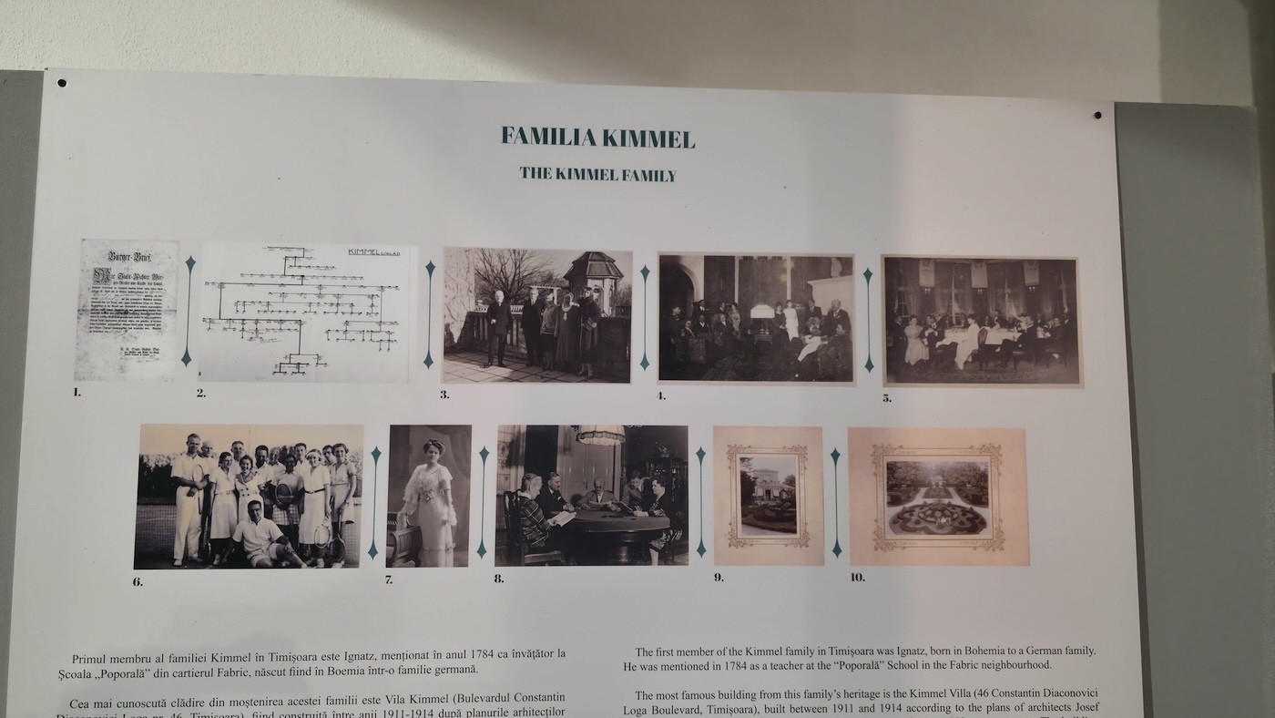 Expoziția vorbește, printre altele, despre familiile Bohn și Muschong, de destinul cărora se leagă cărămizile de Jimbolia și Lugoj, Jakob Muschong, „Regele Cărămizilor” fiind și o persoană care s-a implicat la un moment dat în revitalizarea stațiunii Buziaș, pe care a achiziționat-o cu 900 000 de coroane. Aflăm despre viața lui Francisc Branislav Mircsetics, născut într-o familie de comercianți, care a absolvit la Berlin un curs de decorator de vitrine, iar mai apoi și-a deschis la Timișoara o afacere cu produse coloniale și delicatese, și a participat frecvent la concursurile și expozițiile de vitrine. Sau despre familia Kimmel, de numele căreia se leagă construcția uneia dintre (în opinia mea) cele mai frumoase edificii din oraș, Vila Kimmel de pe bd. C.D. Loga, cu elemente din arhitectura clasicistă franceză a sec. al XVIII-lea, care din 1992 este sediul Institutului Francez din Timișoara.