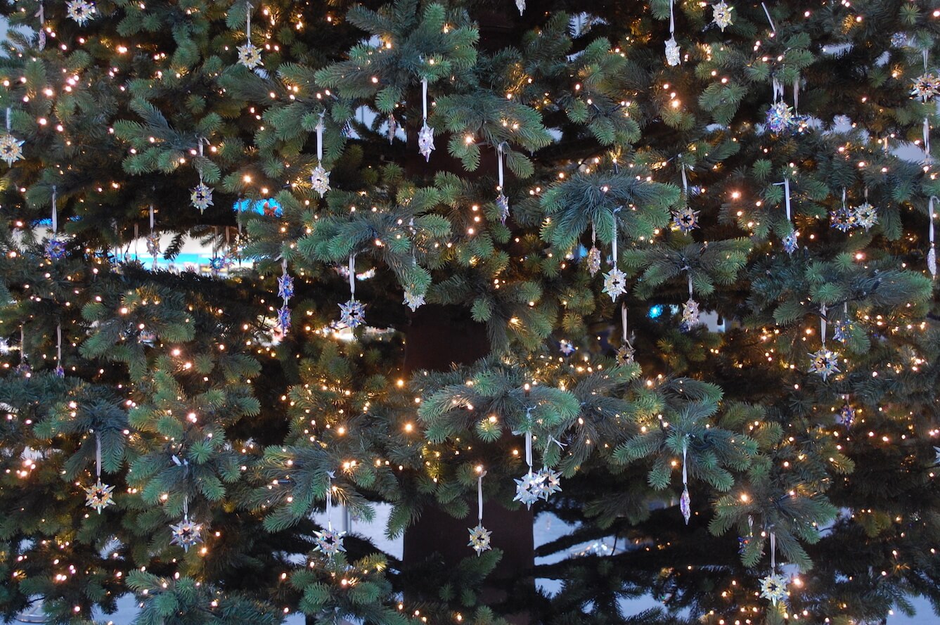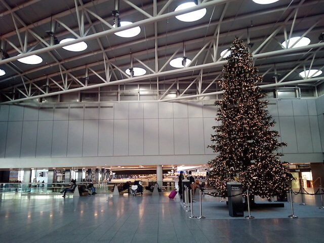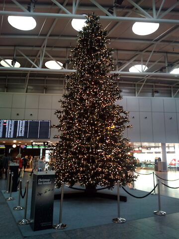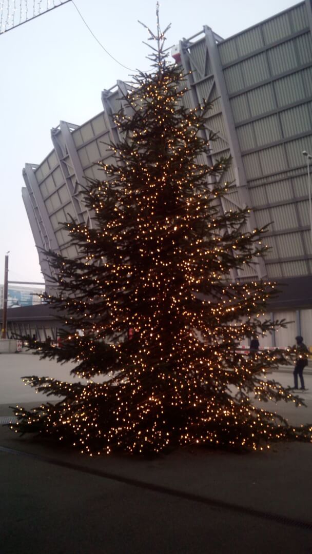 Când ieși din aeroport, într-o banală stație de autobuz și tramvai te așteaptă alți doi-trei brazi la fel de „banali”, decorați numai cu luminițe albe.