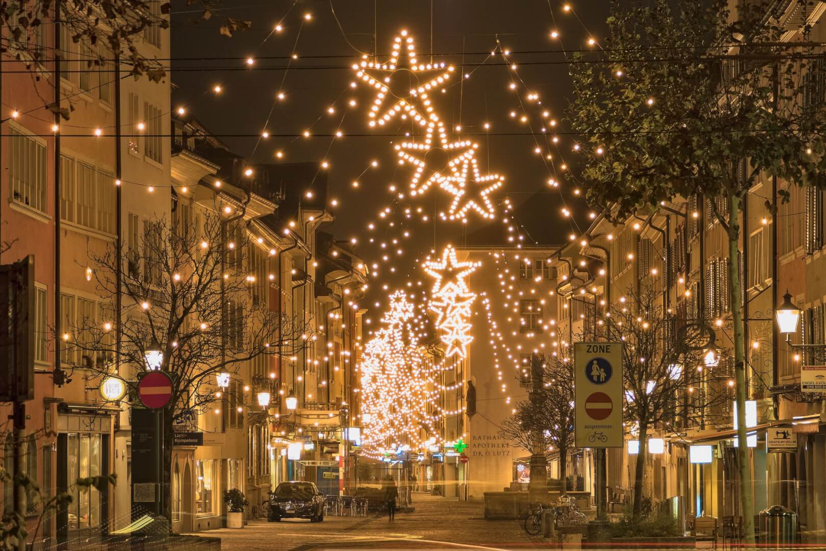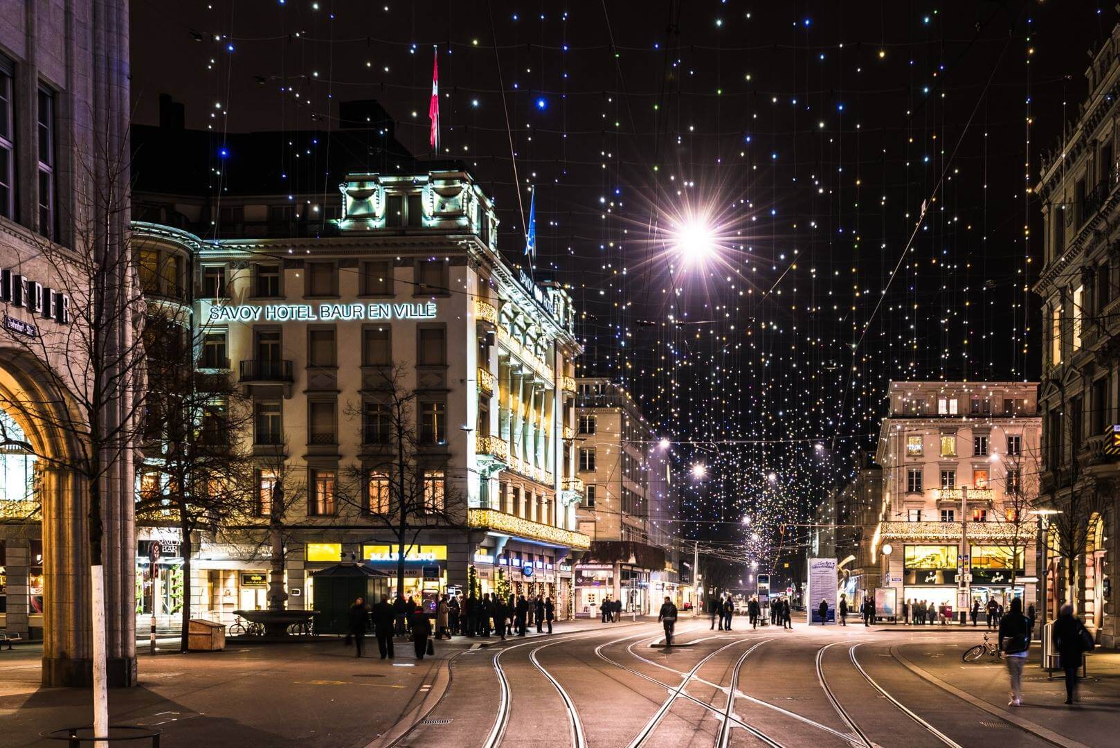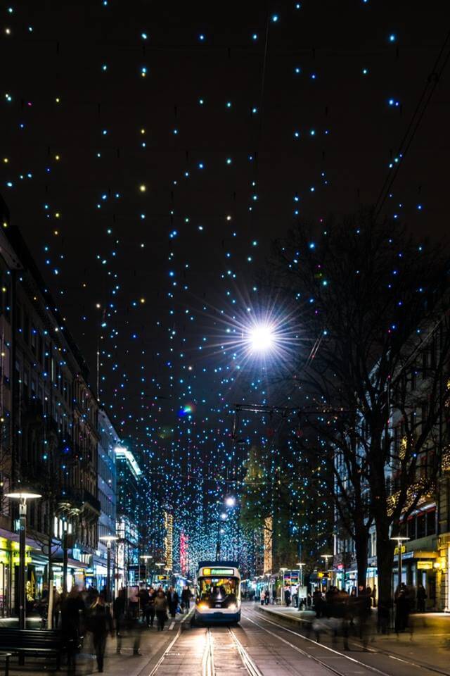 Pe faimoasa Bahnhofstrasse, plină de magazine ale tuturor brandurilor importante, o stradă care duce de la gara principală spre lacul Zürich și care este intens circulată de localnici și de turiști deopotrivă, au realizat o ploaie de lumini care poartă chiar și un nume: Lucy. Și aceste beculețe sunt unele care se repetă deja de la an la an. Deci investiția s-a făcut o singură dată pentru mai mulți ani. Arată spectaculos și conferă străzii o adevărată atmosferă de sărbătoare, de îndată ce se lasă întunericul peste oraș.