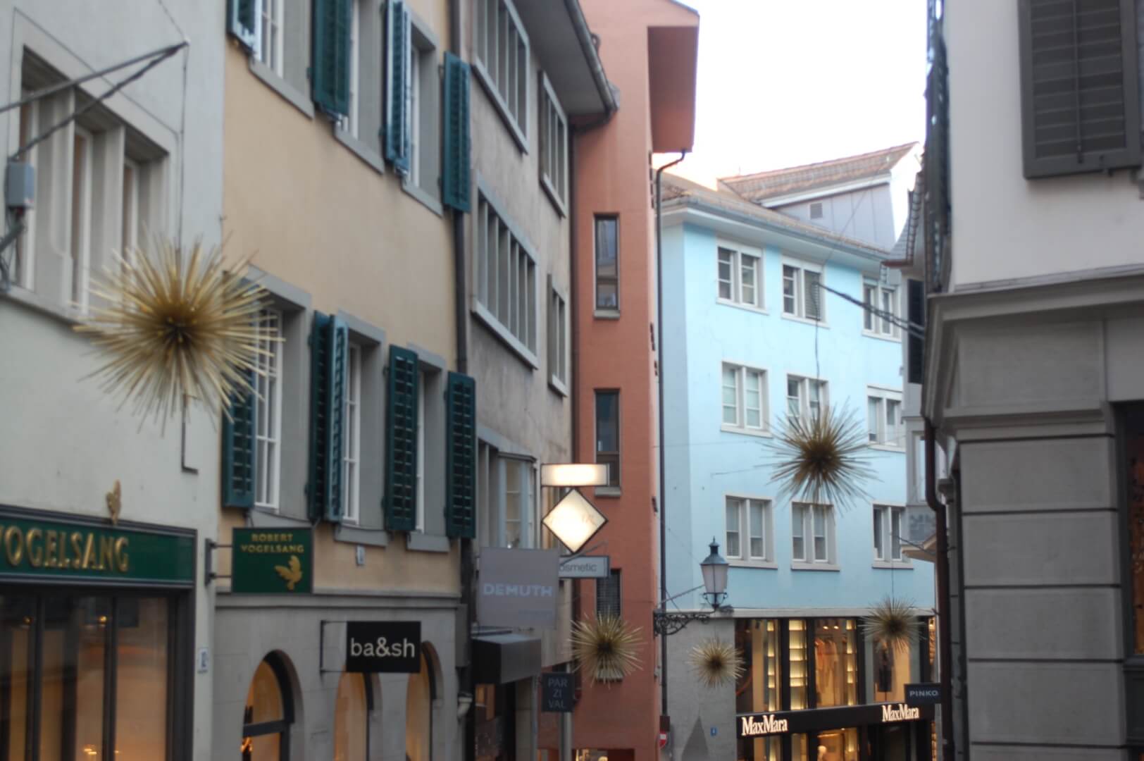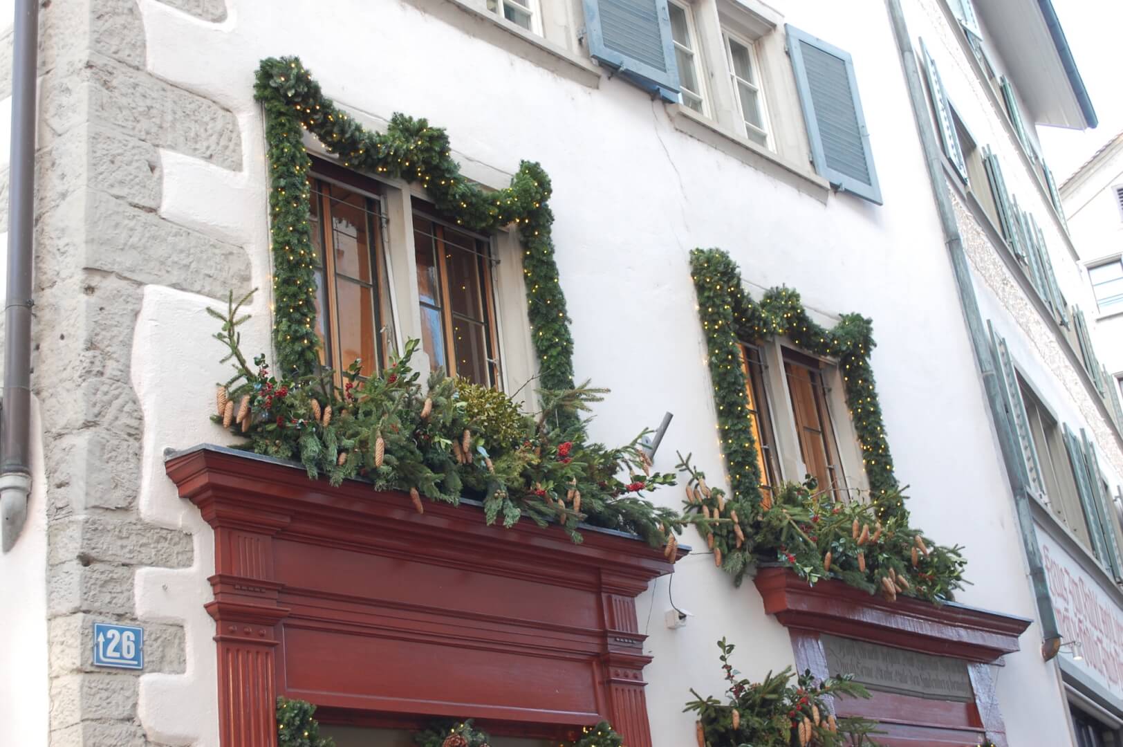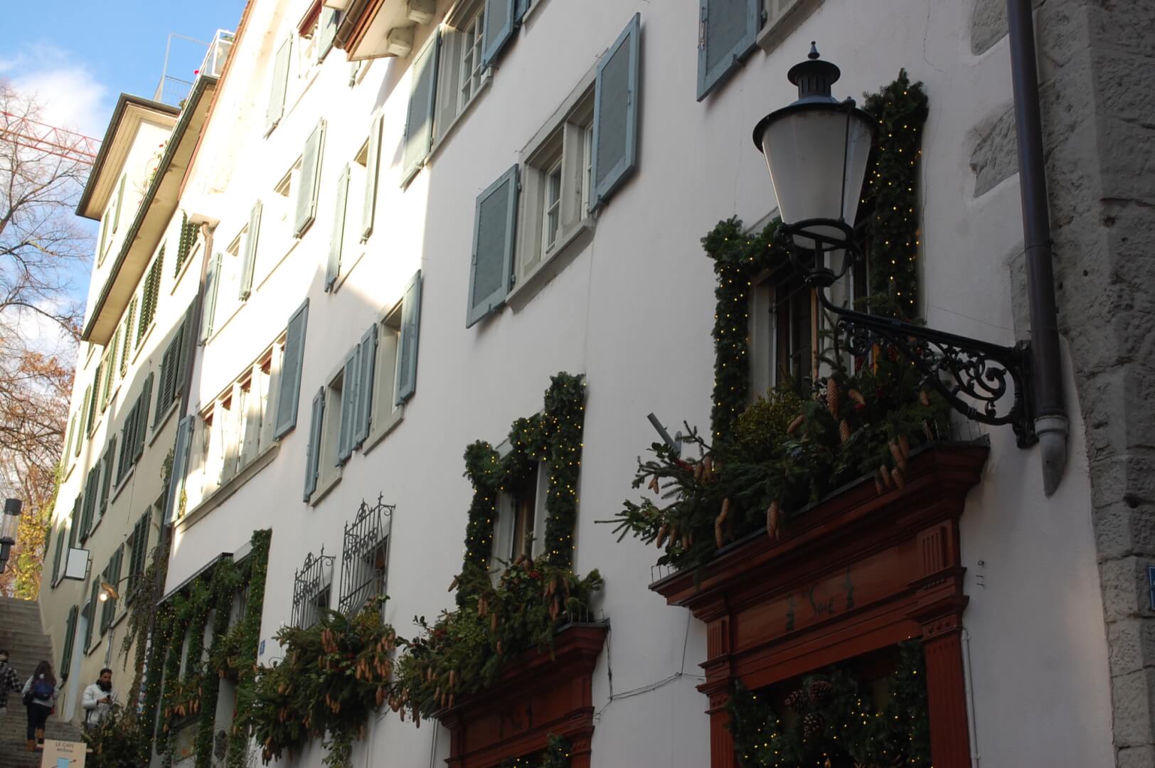 În Zürich nu am văzut niciun Moș, niciun ren, niciun om de zăpadă, nici lumini verzi-roșii-galbene-albastre, nici diverse figurine din diverse materiale. Doar luminițe simple, brazi împodobiți clasic, ghirlande din crengi de brad (artificiale sau nu) și decorațiuni naturale (conuri de brad și altele asemenea). Pe alocuri, câte o fundă roșie, elegantă și jucăușă în același timp.