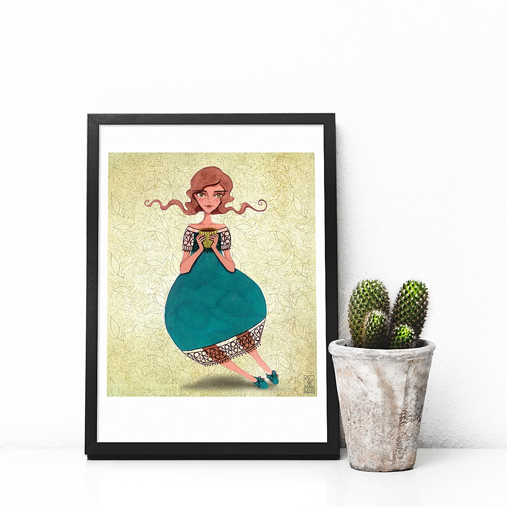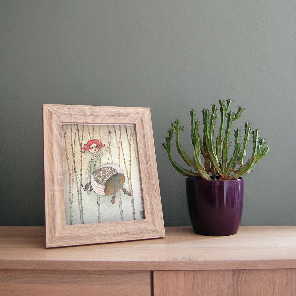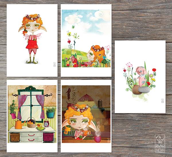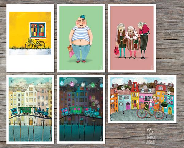 Mult de tot îmi plac ilustrațiile sale înrămate, gata de a fi agățate pe perete, precum și seturile de printuri realizate pe hârtie de 300 de grame, gata asortate pe tematică și culori, disponibile în mai multe dimensiuni. Majoritatea sunt potrivite și pentru a decora camera copilului și pot fi oferite cadou. (Alegeți asta, nu personajele Disney din plastic…)