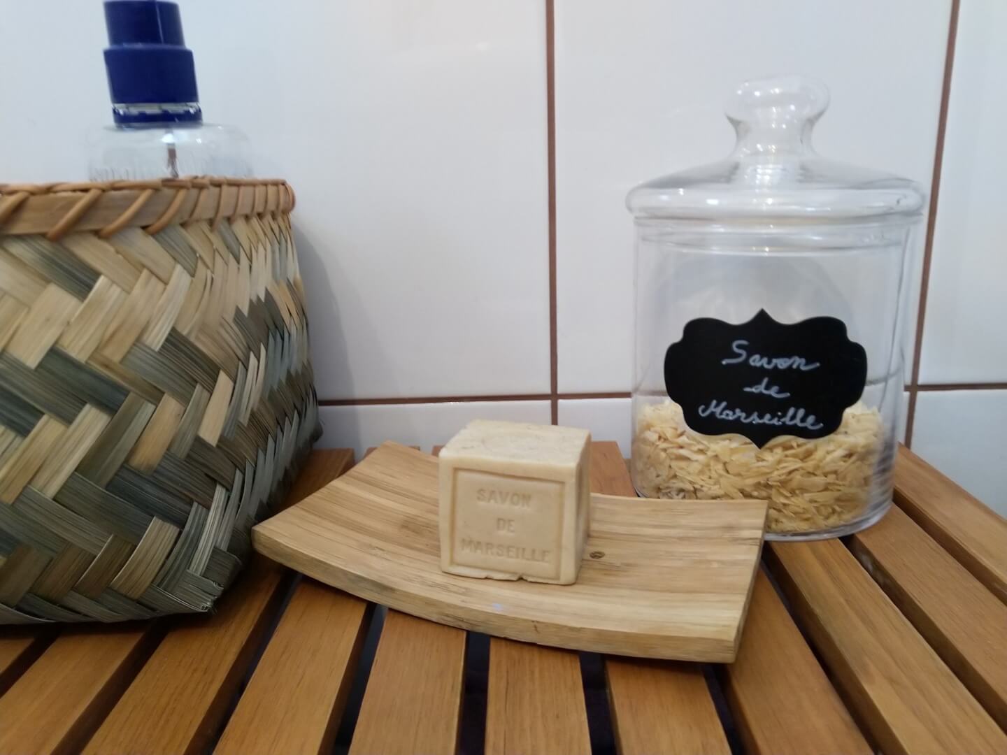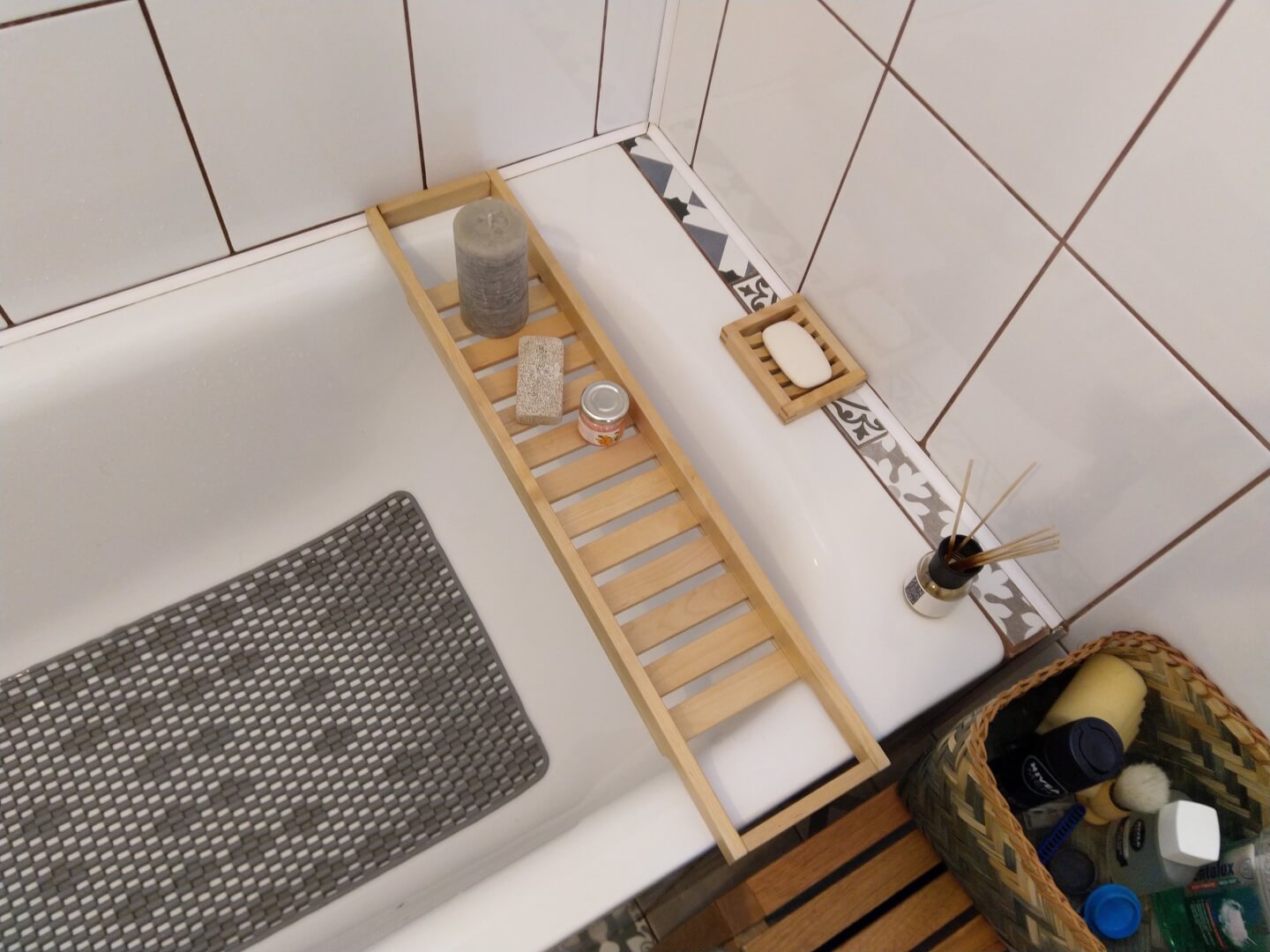 Am adăugat câteva nimicuri de altfel foarte importante, de ex., accente de lemn, pentru a mai „îndulci” atmosfera rece dată de atât alb și așa de multă faianță (necesară, din păcate). Și niște decorațiuni, desigur – lumânări, fotografii înrămate, săpun de casă decorativ, coșuri împletite etc. (Pepco, IKEA, Kik, Tedi, Libro).