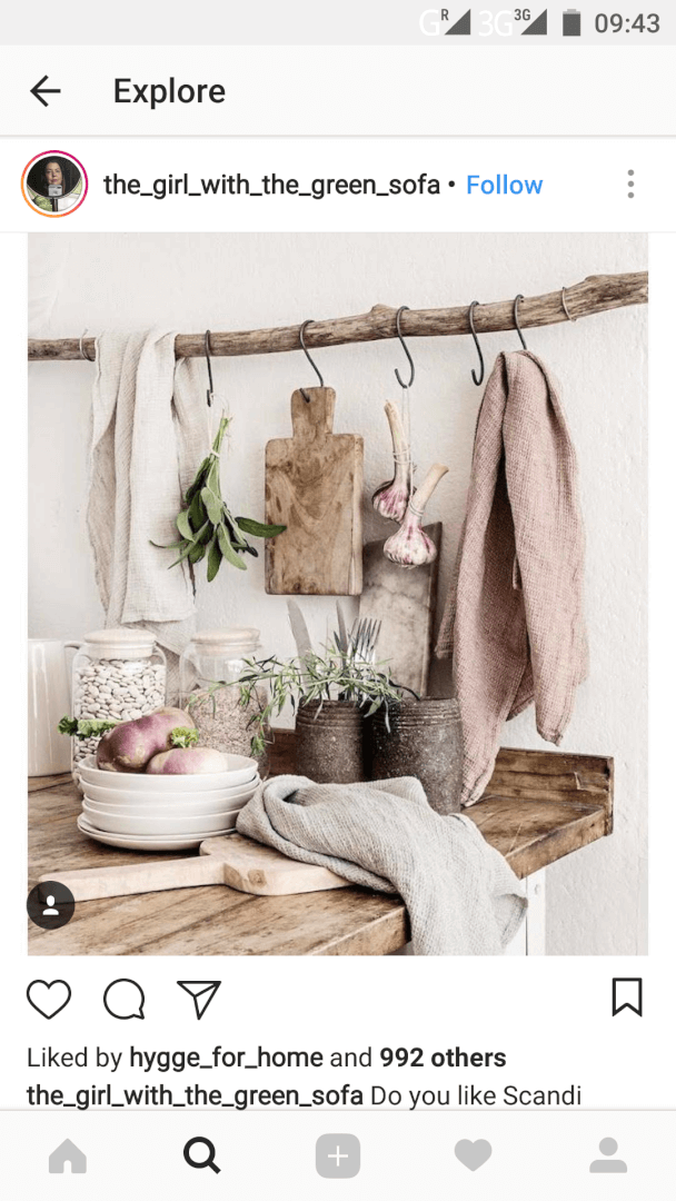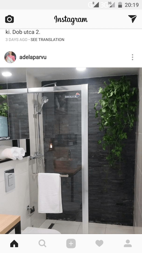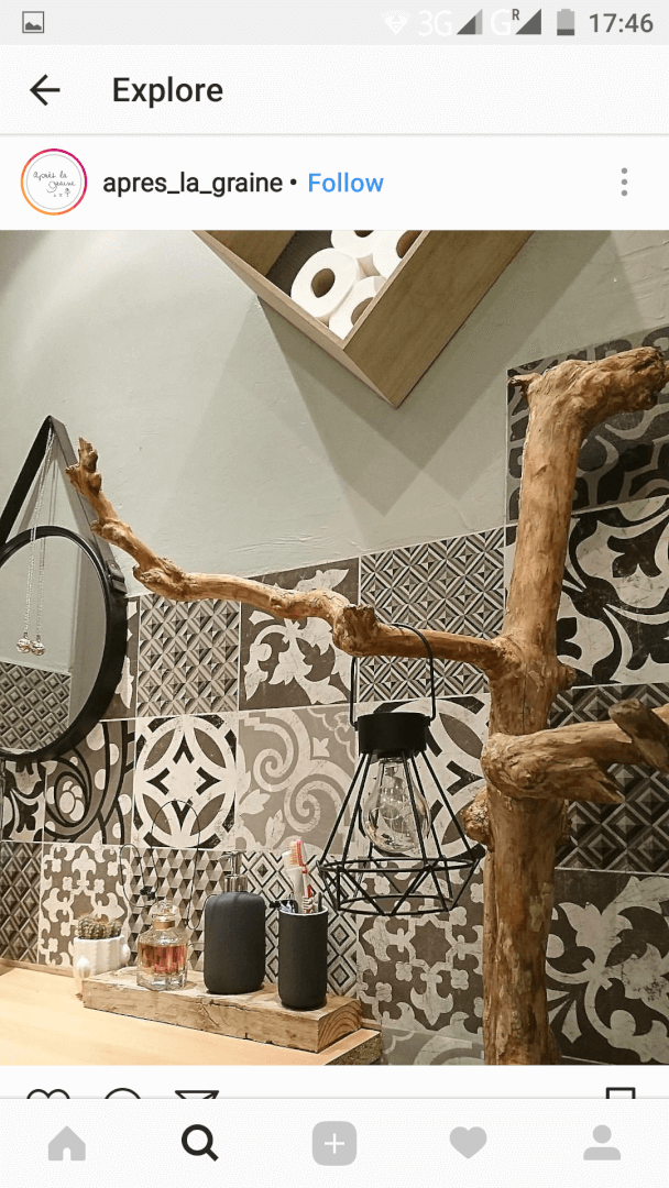 O creangă (da, o creangă pur și simplu!) pe care voi monta niște cârlige negre, metalice pentru prosoape; un mic dulăpior alb în colț; o plantă verde, curgătoare. Inspirația pentru aceste lucruri vine de pe Instagram, iată screenshot-urile:
