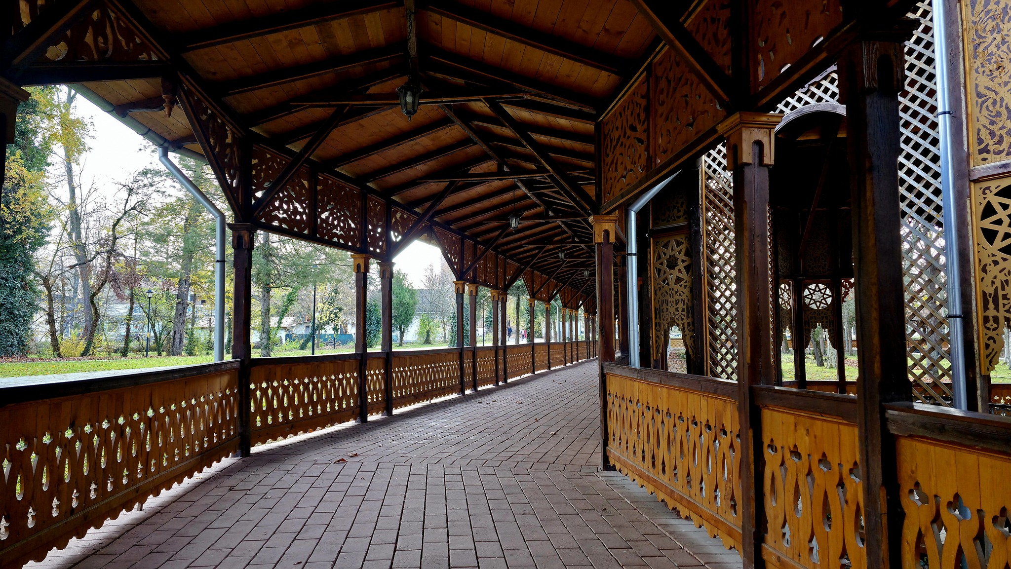 Cea mai recognoscibilă din tot Buziașul este colonada – frumos renovată în urmă cu câțiva ani. A fost inaugurată în 1875, la inițiativa împăratului Franz Joseph, și a fost realizată, de fapt, pentru celebra Sissi, ca plimbările prin parc să fie posibile și atunci când plouă. Are 500 de metri lungime, lemnul fiind sculptat în stil bizantin.