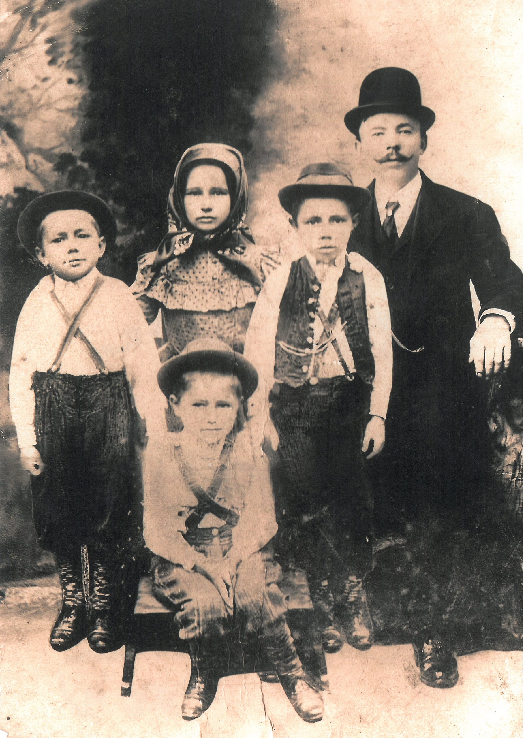 În 1907, soțul József Benda a decis să își încerce norocul peste Ocean: a urcat într-un vapor la Fiume (acum, Rijeka), iar în 19 septembrie 1907 a acostat la New York. Peste câțiva ani s-a mai întors acasă, unde avea deja trei fii: pe străbunicul meu, József, primul născut (n. 1900), pe János (n. 1902) și pe Sándor (n. 1904). Fotografia de mai jos – care acum se află în vitrină, la muzeu – a fost realizată cu ocazia vizitei sale acasă și îl înfățișează alături de soție și de cei trei copii. Cel mai înalt dintre ei este străbunicul meu.