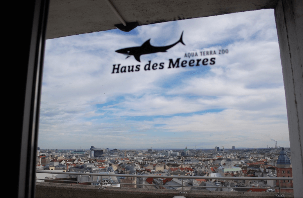 Haus des Meeres (Casa Mării, adică) se află în zona centrală a orașului, în vecinătatea Mariahilferstrasse. Luați metroul U3, coborâți la stația Neubaugasse, de unde mai aveți de mers pe jos vreo 2 minute. Este, de fapt, un mic zoo, găzduit de unul dintre cele șase turnuri de apărare antiaeriană ale Vienei. Voi mai reveni asupra acestui loc. Acum ne interesează, însă, doar terasa de pe acoperișul său, de unde panorama este, iarăși, superbă. De view pot avea parte nu doar vizitatorii Haus des Meeres, ci oricine: pe terasă se poate ajunge și pe o scară aflată pe exterior.